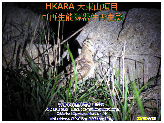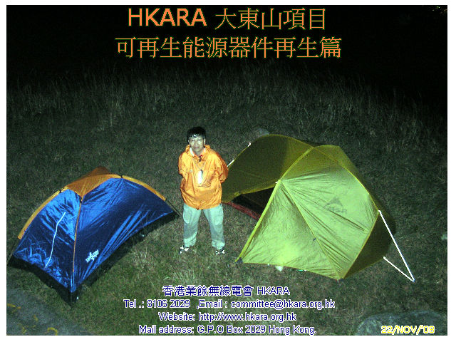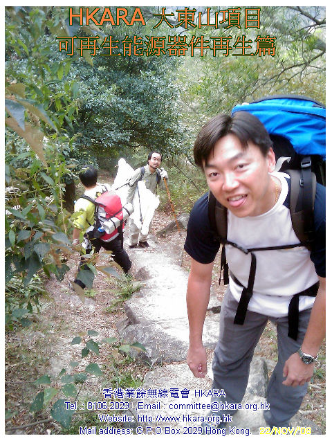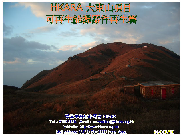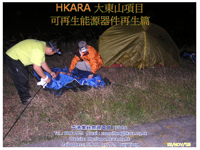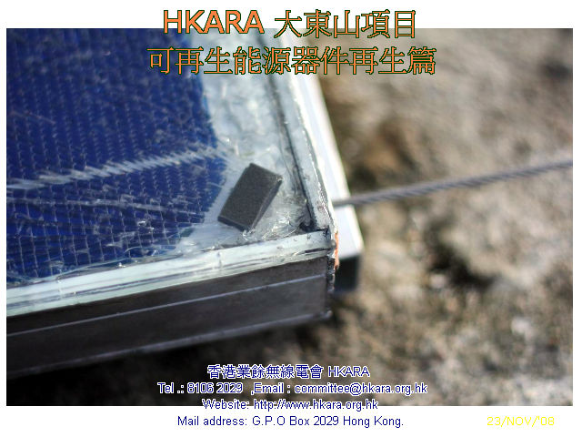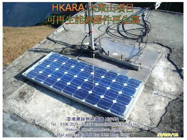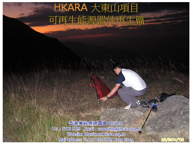 | 此行主任務: 重生一塊可用破損了的太陽能電池板 考慮物料可再用、資金,運輸等多項因數後,HKARA 項目組製定了一連串修復大東山可再生能源設施方案,並於昨天(22 Nov.08)下午及今天(23 Nov.08)完成首項修復工作, 是項修復涉及難度: #合適天氣(乾燥、微風及不寒) #完好運送玻璃上山 #修復工藝 22 Nov.08 15:30L 一行四人於東涌郵局集合,磋商後兵分兩路上 伯公坳起點,雖然已包護好玻璃但仍被拒乘巴士,後乘的士在途 中匯合全隊齊往伯公坳,18:08L 抵 大東山 "Zulu"。 組員迅速整裝開展工作,22 Nov.08 21:35L VR2VYB 及VR2XVD 先把包裝物料、壞損配件等帶回山下處理,於 22:25L返伯公坳。VR2ZYA 及 VR2ZIP 繼續至 23 Nov.08 中午完成太陽能電池板重生工作後下山。經初步日光測試太陽能電池板尚可用,估計可"養活" 大東山項目電池庫,距重開項目內VR2Z " Zulu 仔" 中繼站目標近了一步。 重開 " Zulu 仔" 還需找有能人幫忙運後備風車上山,加上三、數次上山工作才可,齊齊努力吧! |